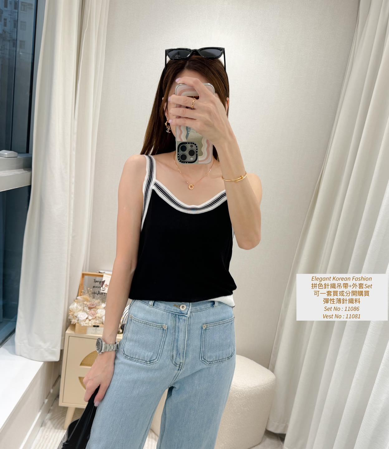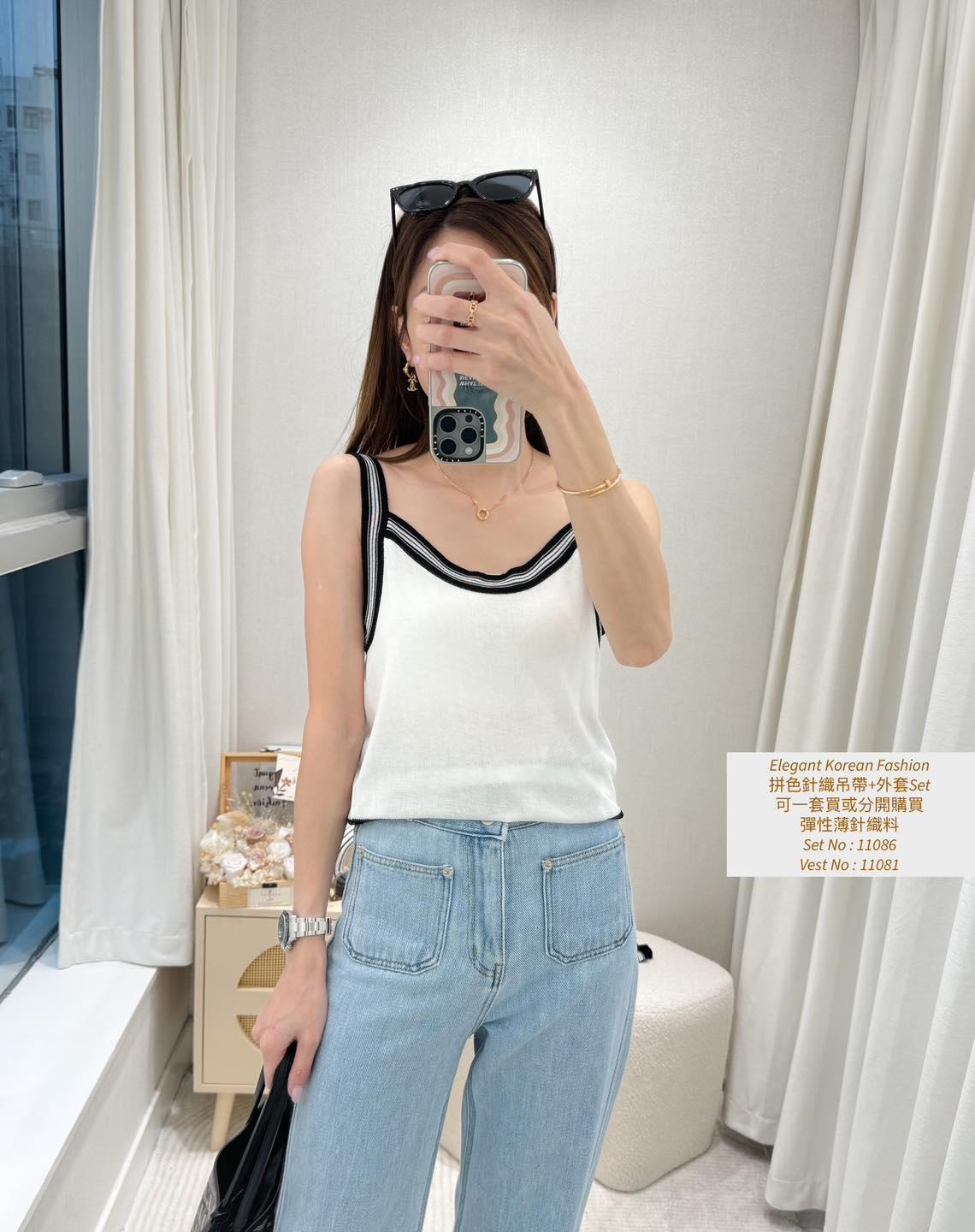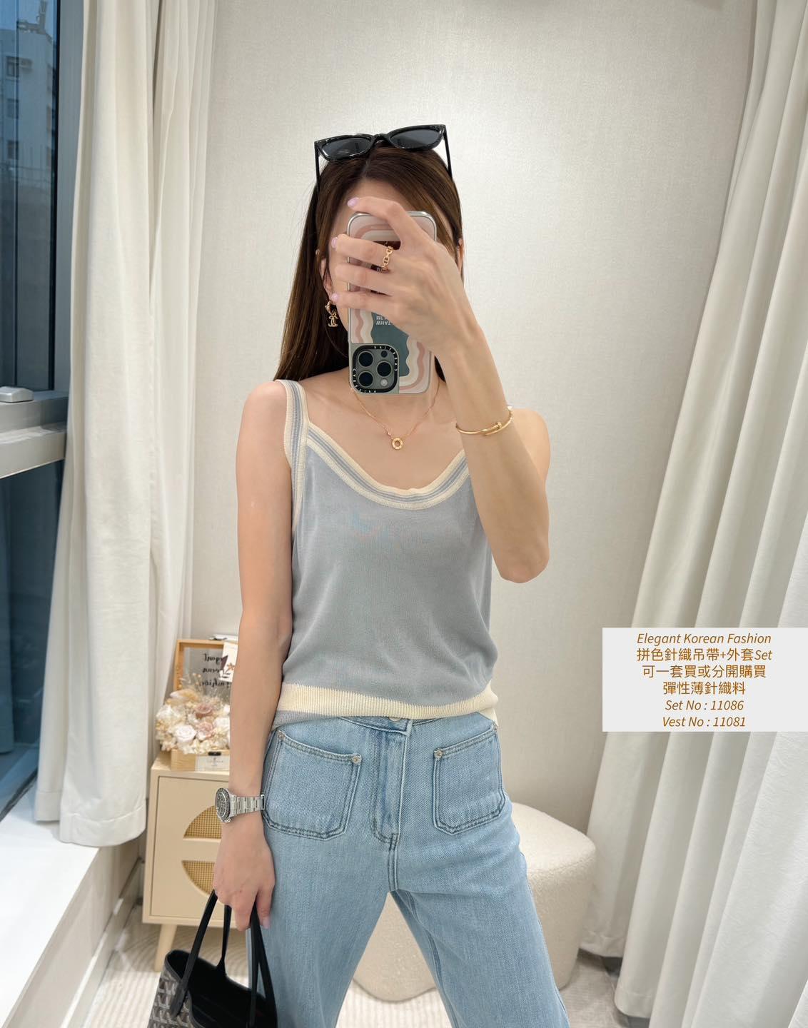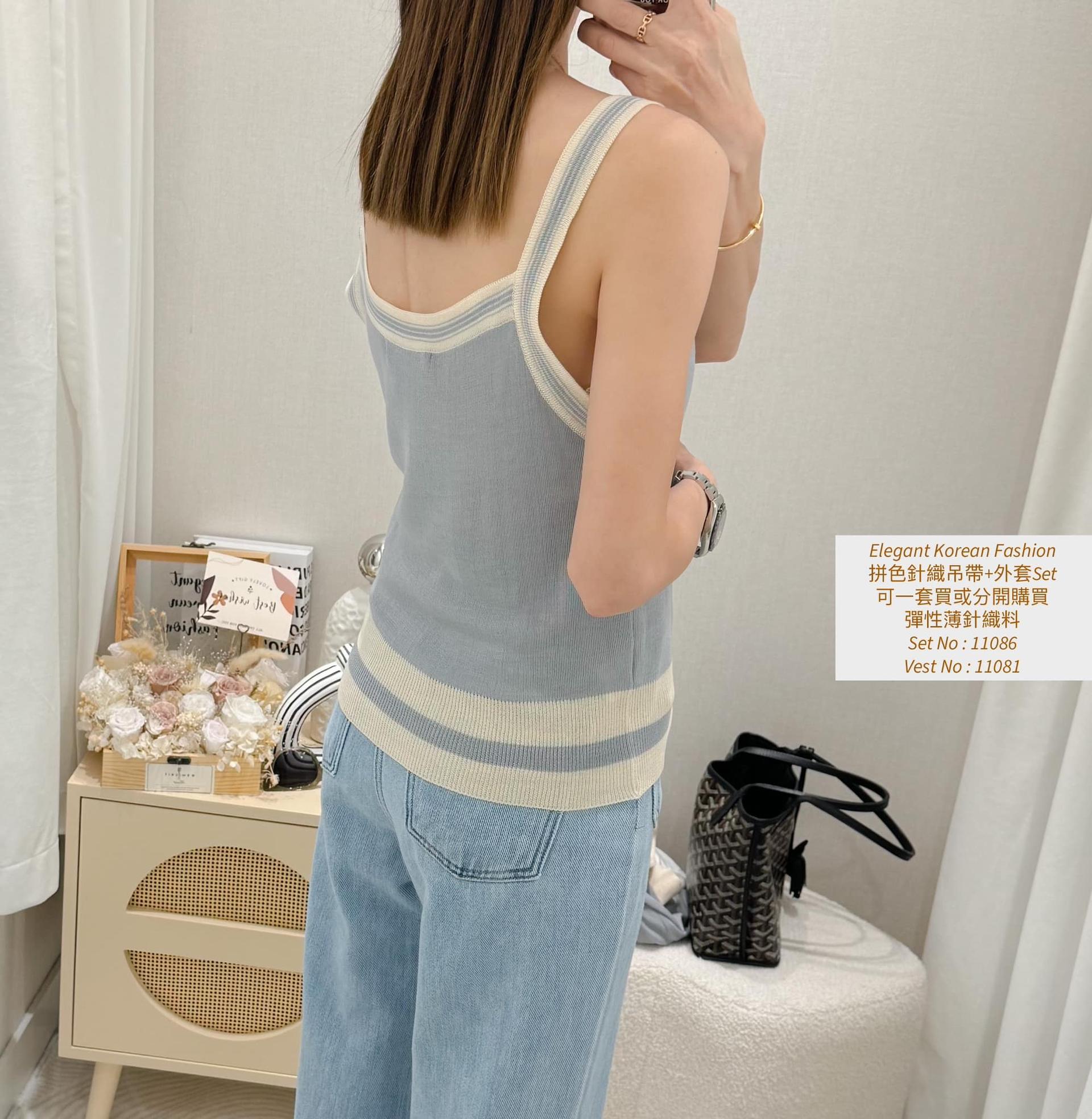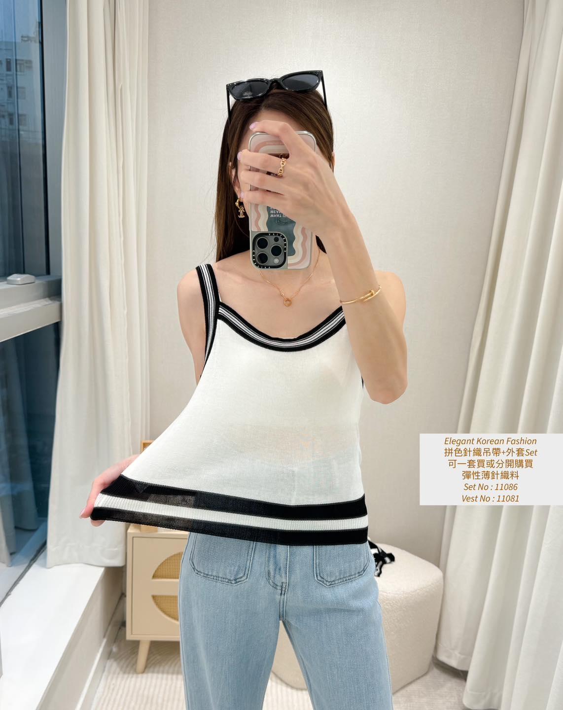拼色針織吊帶Top 單著或襯外套都靚呀 可一套買或分開購買 彈性薄針織料 白色灰藍黑色3 Colour Vest No: 11081 Vest+Cdg Set No: 11086 Vest Size : Chest 32-44 Length 21"