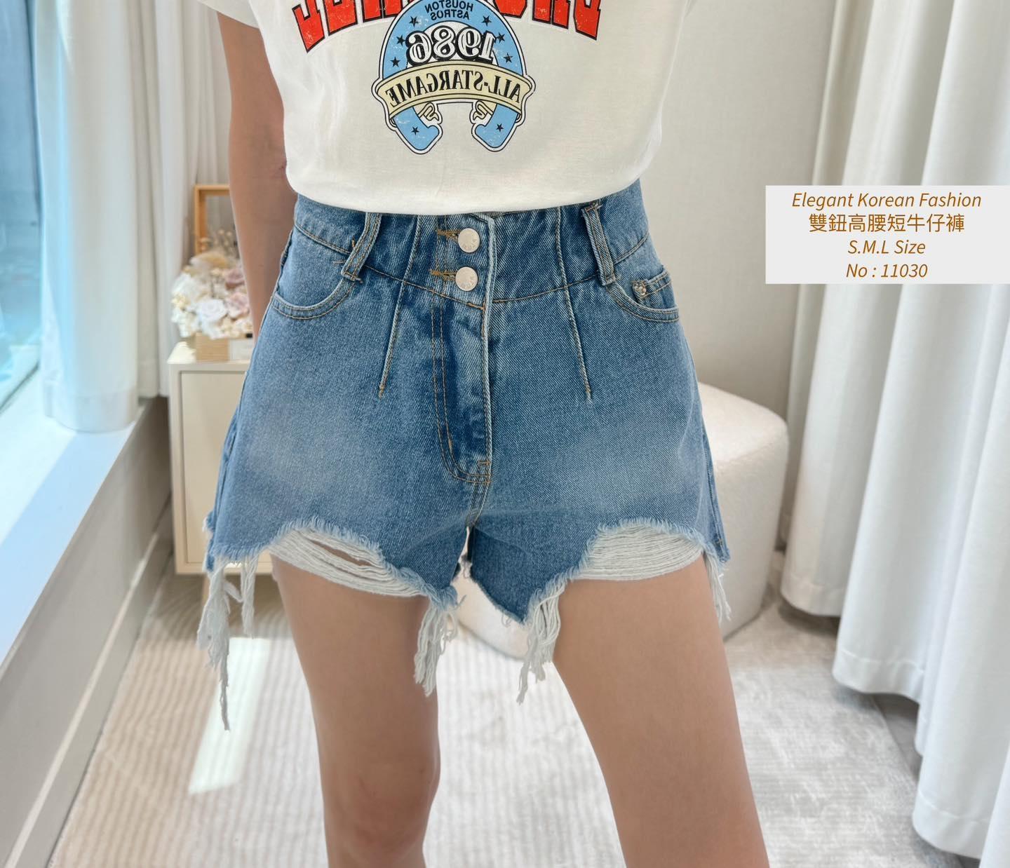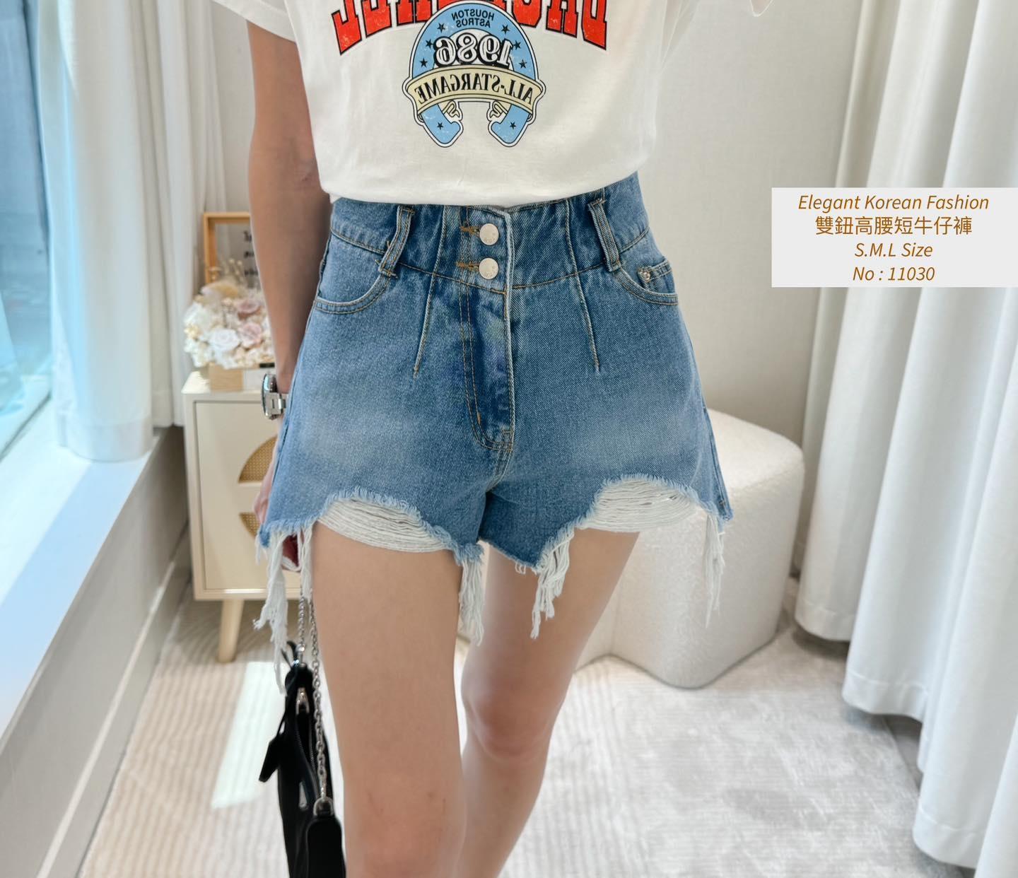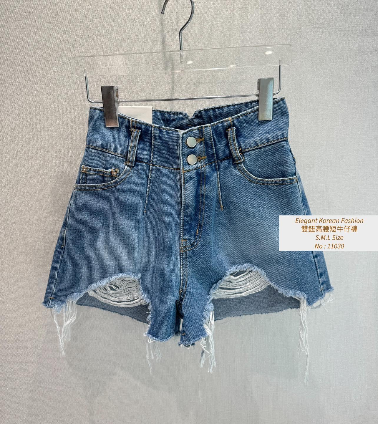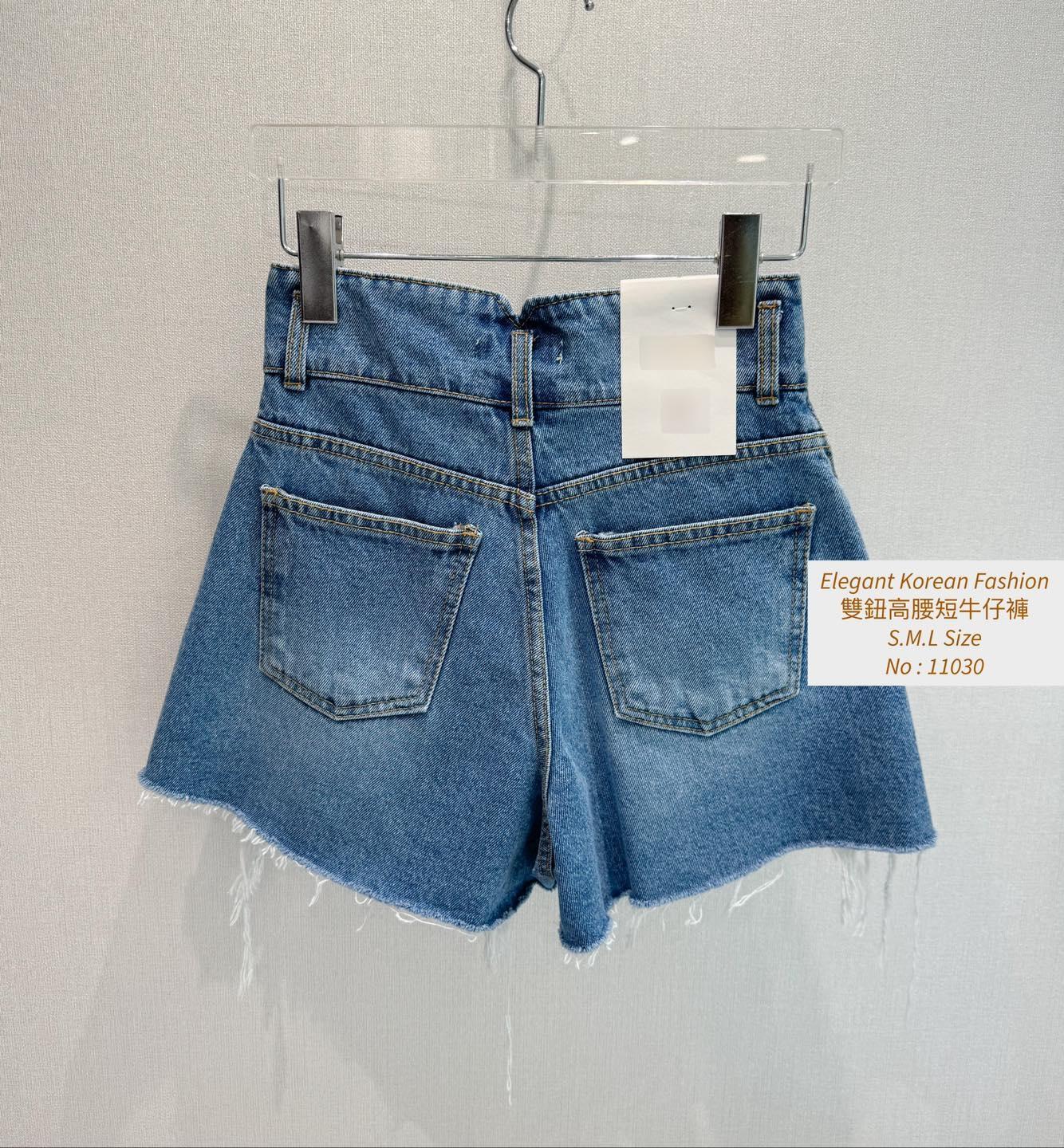 雙鈕高腰短牛仔褲 前車骨位好修腰 One Colour No: 11030 S.M.L Size : (S) Waist 24 Hip 34 Length 13" (M) Waist 26 Hip 36 Length 13.5" (L) Waist 28 Hip 38 Length 13.5"