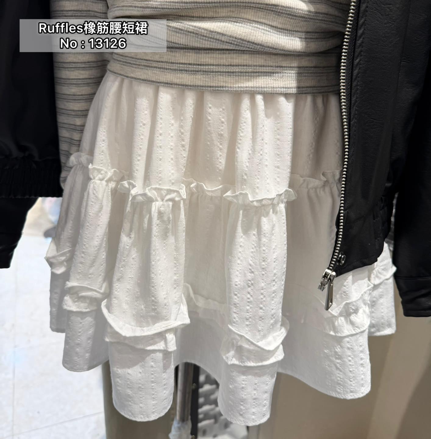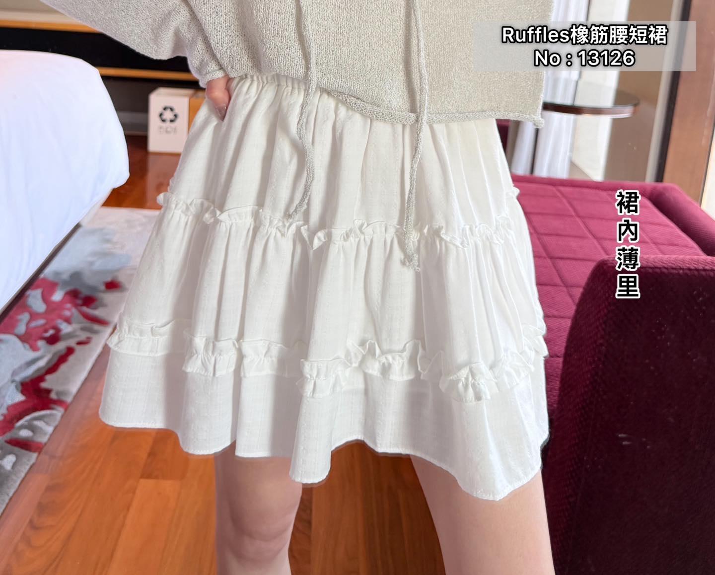 ・❥・Ruffles 橡筋腰短裙・❥・ ・❥・裙內薄里 ・❥・暗紋通花款 1 色 白色 ✎ No: 13126 ✎ Free Size : Waist 22-36 Hip 44 Length 15"